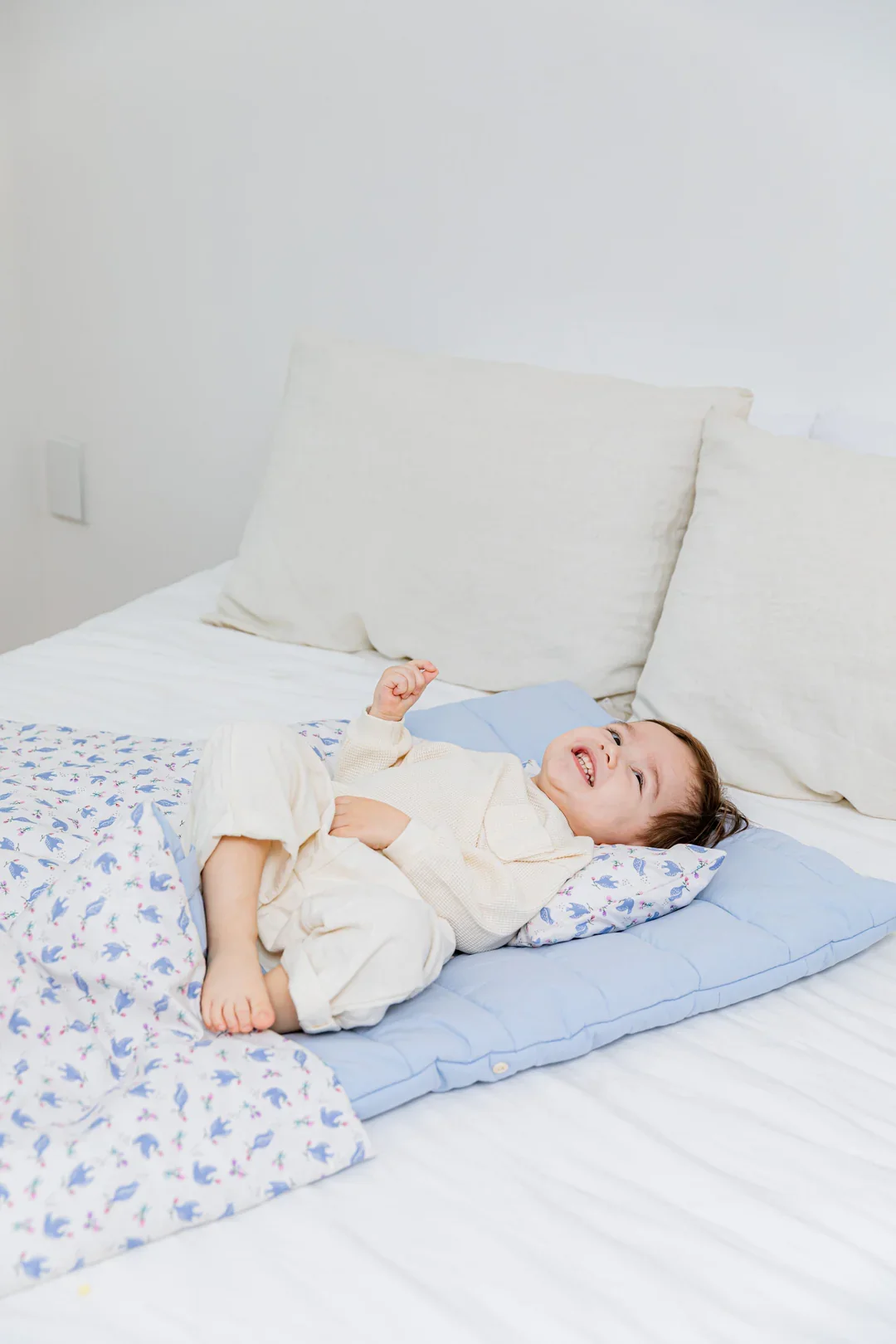 Our bedding set comes with a separate pad, blanket, and pillow. We’ve added snap buttons to the pad and blanket so they can be easily connected, allowing the blanket to stay in place when your little ones move around in their sleep.